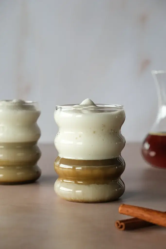 - Gib den Sojadrink mit dem Ahornsirup und der Vanille in den Milchaufschäumer.